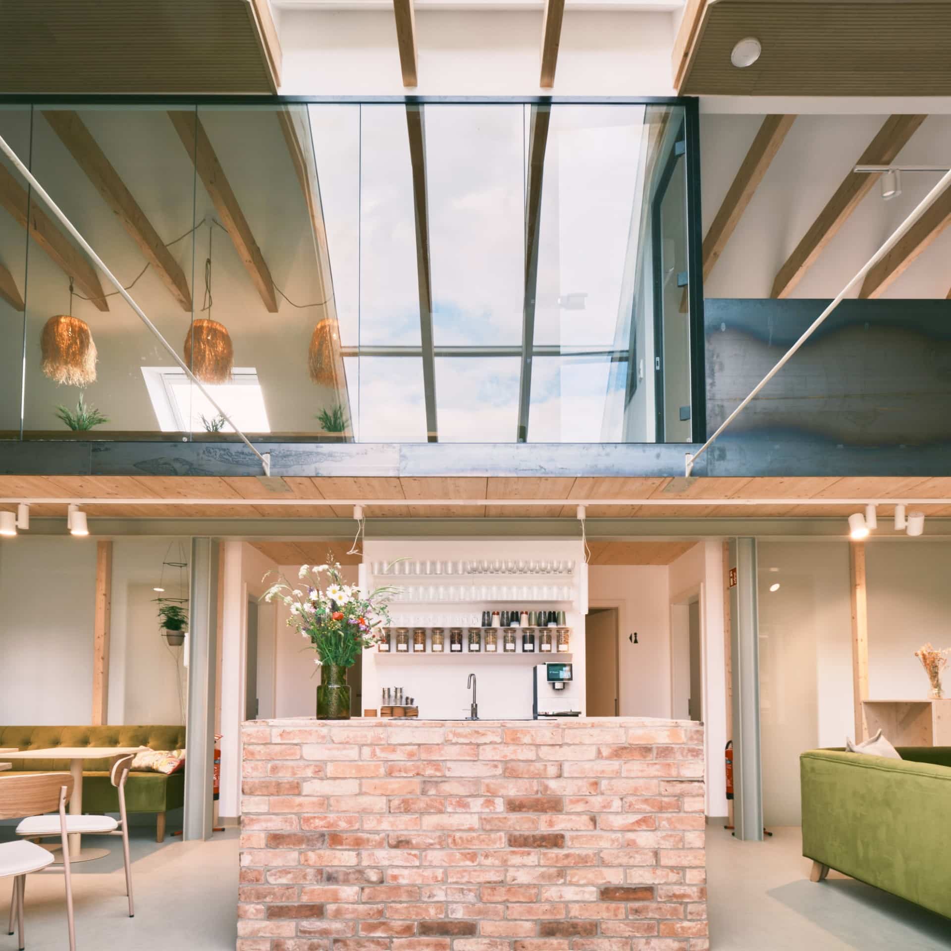 offener Bereich mit Kücheninsel | Bistroplätzchen | geschlossene und offene Doppelbüros | Workshop- und Besprechungsräume | Wohnzimmerecke | überdachter Außenbereich mit Blick auf den Hof | Übernachtungsmöglichkeit